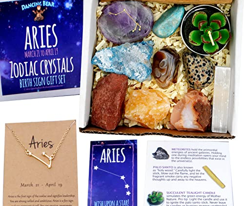 DANCING BEAR Aries Zodiac Healing Crystals Gift Set, (14 Pc): 9 Stones, 18K Gold-Plated Constellation Necklace, Meteorite, Succulent Candle, Palo Santo Smudge Stick, and Info Guide, Made in The USA